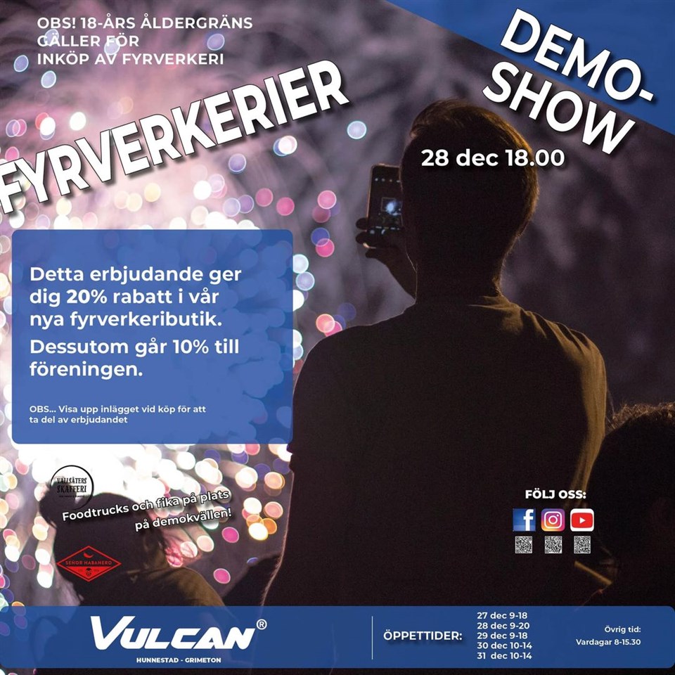 Hos vĂ„r samarbetspartner Vulcan Europe fĂ„r ni 20% rabatt pĂ„ nyĂ„rsfyrverkerier och samtidigt tjĂ€nar föreningen hela 10%. SĂ„ passa pĂ„ att fira in det nya Ă„ret med ett vackert och hĂ€ftigt fyrverkeri! Passa Ă€ven pĂ„ och kom till demoshowen 28 december kl 18:00. Varmt vĂ€lkomna till TjĂ€rby 37, Hunnestad?432 98 GRIMETON đđ